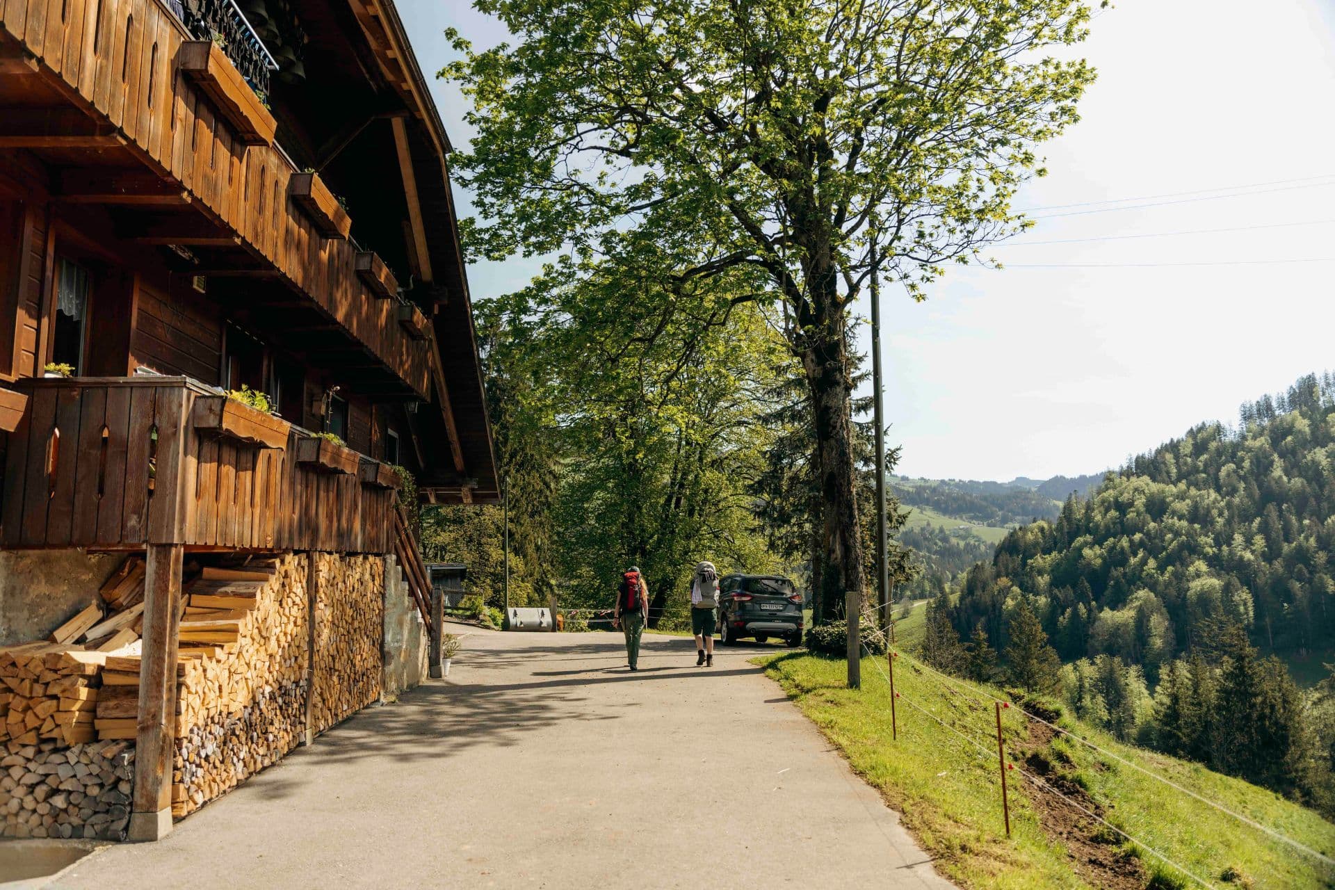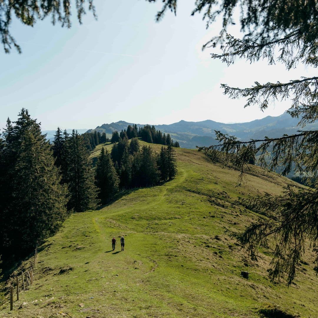 Wir beginnen mit dem Abstieg über grüne Wiesen und durch kleine Wäldchen zum Bergrestaurant Gurli und anschließend noch weiter hinab, bis wir beim Zollhaus und der Sense ankommen. Bei einer kurzen Pause am Flusslauf laden wir unsere Energie auf, bevor der Aufstieg auf dem Gantrisch-Panoramaweg beginnt.
