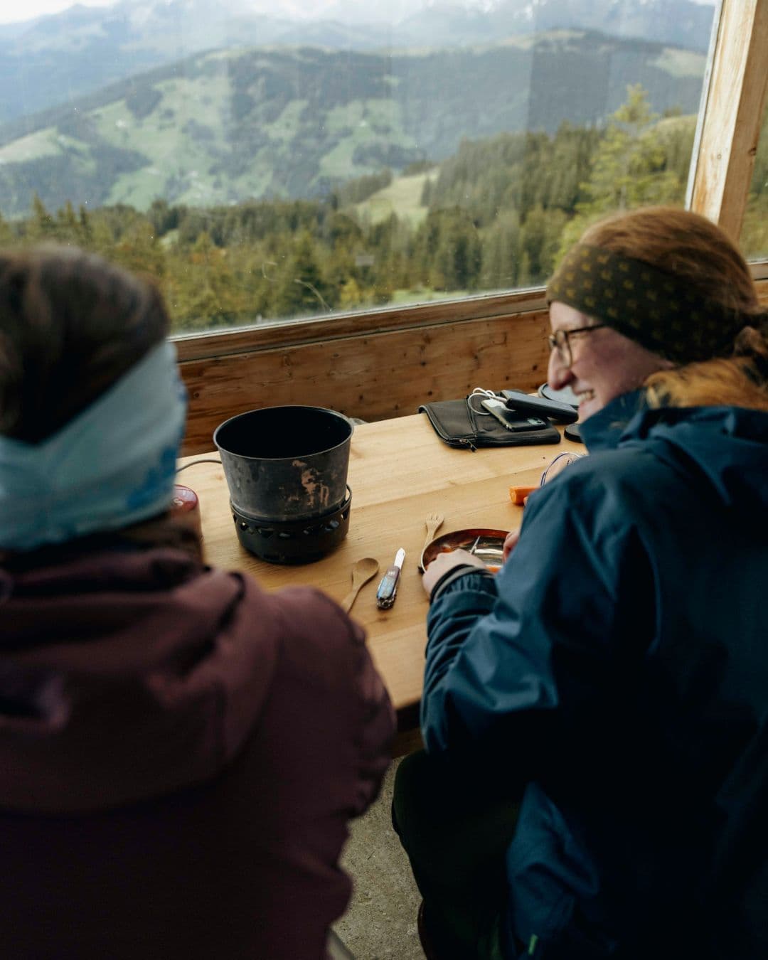 Wir kochen unser Abendessen selbst, doch wer Dienstag bis Sonntag anreist, kann auch im Restaurant der Alphütte leckere hausgemachte Rösti, Flammkuchen, Fondue, Käseschnitten oder andere urchige Leckereien genießen, bevor es kurz unter die Dusche und dann zeitig ins Zelt geht, um die Energie für den nächsten Tag aufzuladen.