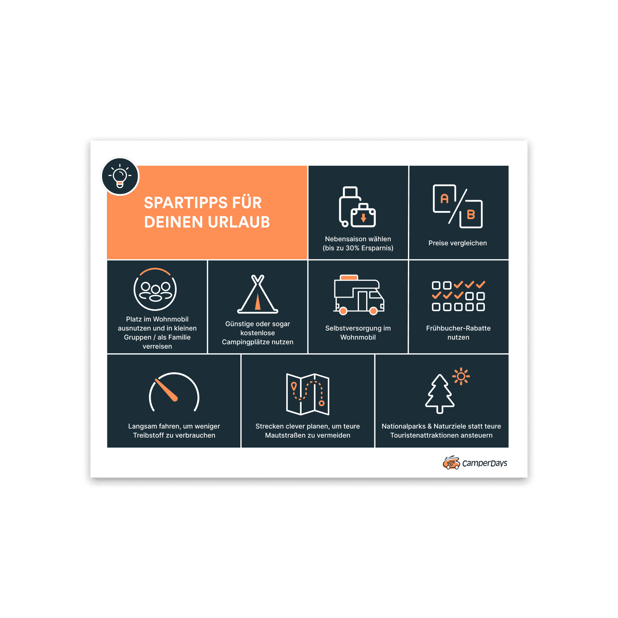 Wie bei Flügen oder Hotels gilt auch beim Wohnmobil mieten: Die Kosten sind stark von der Reisezeit abhängig. In der Nebensaison kannst du ordentlich sparen. Laut einer Studie von CamperDays bist du zum Beispiel in Ländern wie Kanada oder Neuseeland mit dem Wohnmobil in der Nebensaison bis zu 30 Prozent günstiger unterwegs, als mit Hotel und Mietwagen.