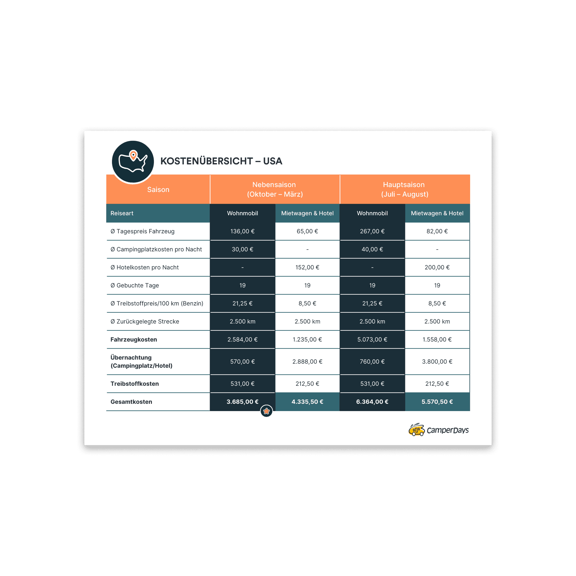 Wenn du für drei Wochen ein Wohnmobil in den USA mietest, sieht die Kostenaufstellung ungefähr so aus: Du zahlst für das Wohnmobil selbst rund 136 bis 267 Euro pro Tag, das macht also 2500 bis 3.000 Euro für die Woche. Für Sprit kannst du bei einer Strecke von etwa 2.500 Kilometern mit rund 531 Euro rechnen. Stellplätze auf Campingplätzen schlagen mit etwa 30 bis 40 Euro pro Nacht zu Buche, insgesamt also 570 bis 760 Euro. In Summe landest du bei ungefähr 3.700 bis 6.350 Euro für deine USA-Reise. Fazit: Mit einem Camper bist du in der Nebensaison deutlich günstiger unterwegs als zum Beispiel mit einem Mietwagen und Hotelkosten. Kosten kannst du allerdings durch Frühbucherrabatte und günstige Stellplätze sparen - aber dazu mehr im nächsten Abschnitt.